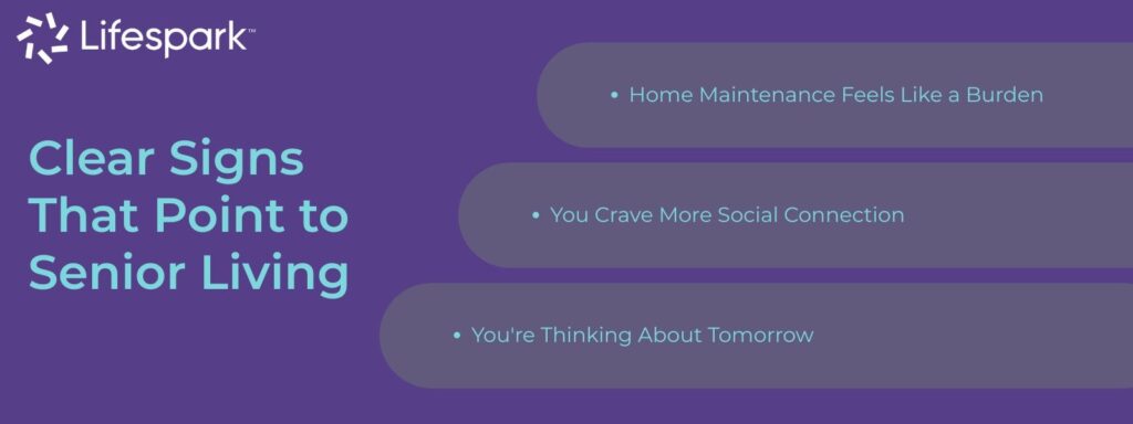 - Key signs include wanting freedom from home maintenance, seeking social connections, and planning for future needs